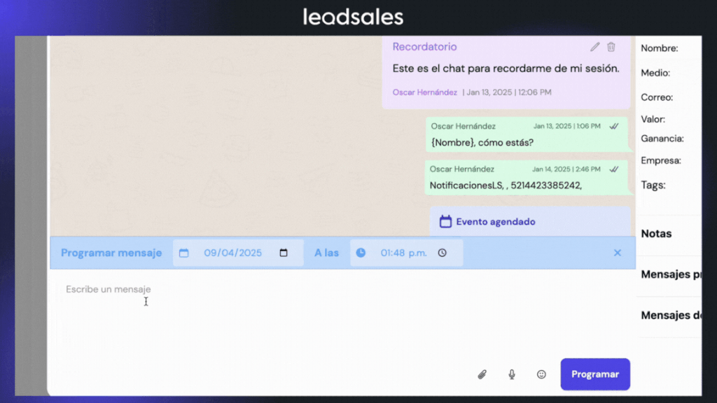 Leadsales te permite programar mensajes y recordatorios automatizados para informar a tus clientes sobre ofertas especiales, promociones o detalles clave de tus productos y servicios. Esto asegura que siempre reciban la información correcta en el momento adecuado.