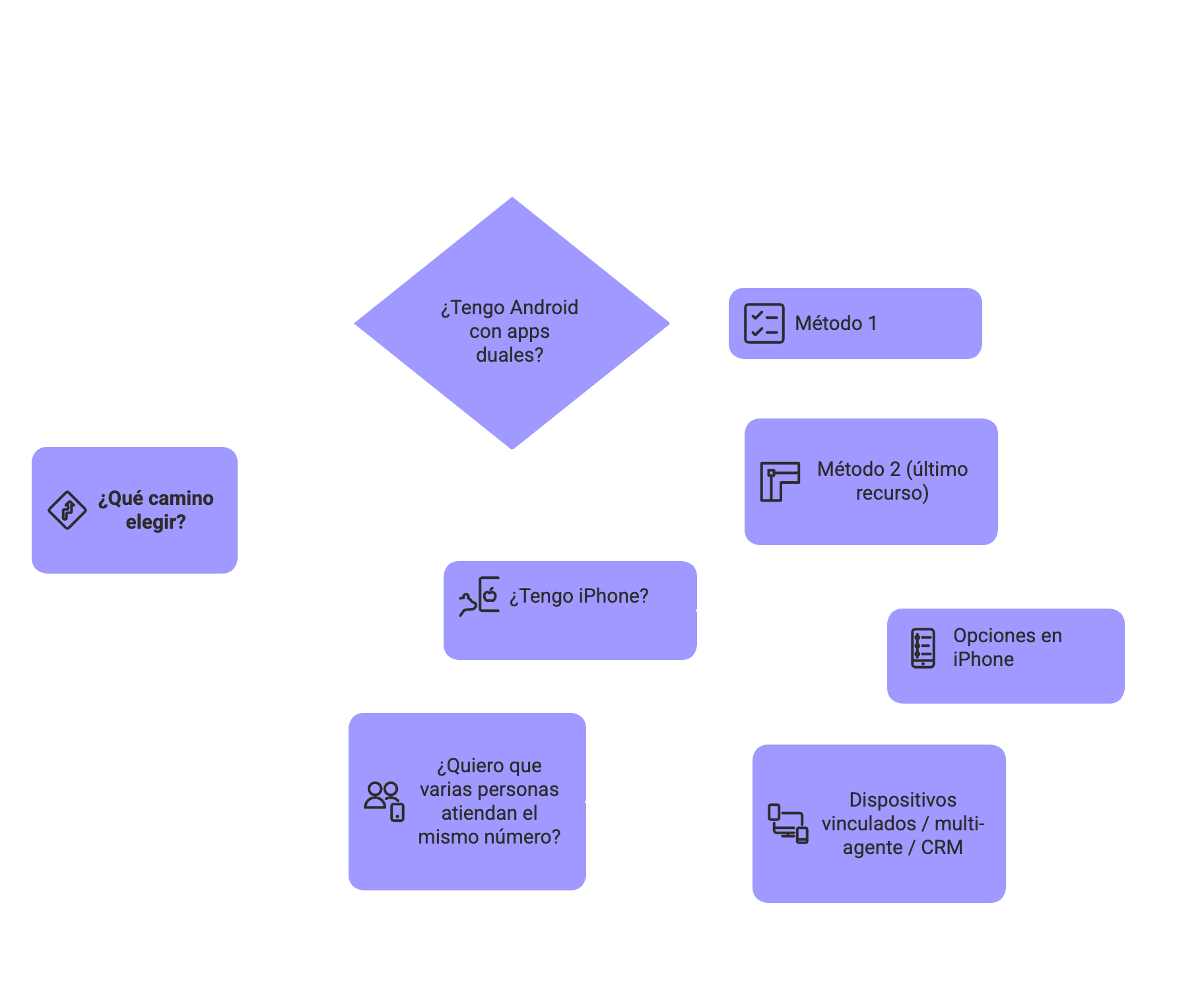- Quiero que varias personas atiendan el mismo número → ve a Dispositivos vinculados / multi-agente / CRM.