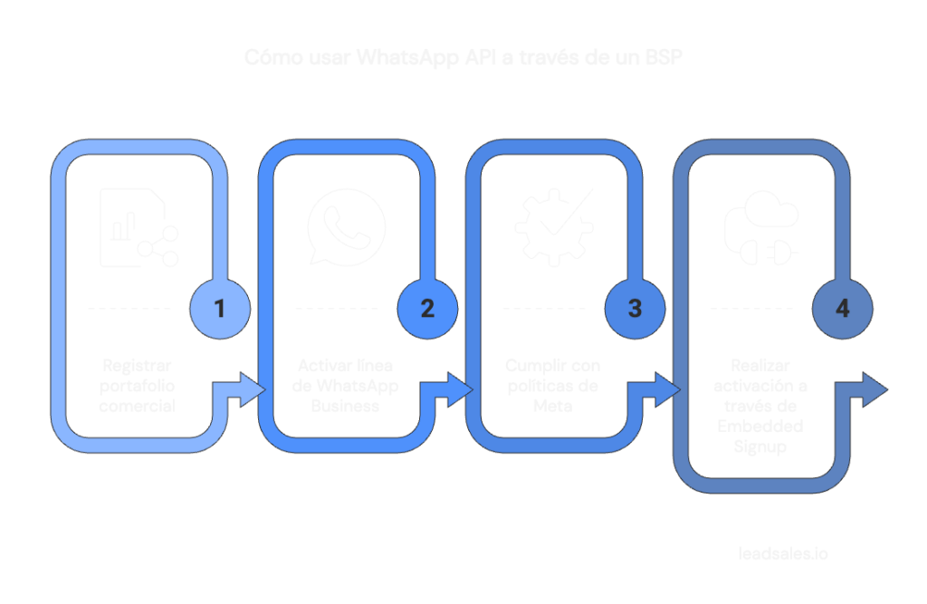 Con un BSP como Leadsales, los pasos que tienes que seguir para usar la API de WhatsApp son los siguientes: