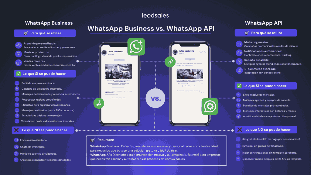 La diferencia principal entre WhatsApp Business y WhatsApp Business API está en el tipo de necesidades que cubre cada una. La app es práctica y sencilla para negocios pequeños; la API es robusta, escalable y pensada para empresas que necesitan profesionalizar y automatizar su comunicación por WhatsApp.