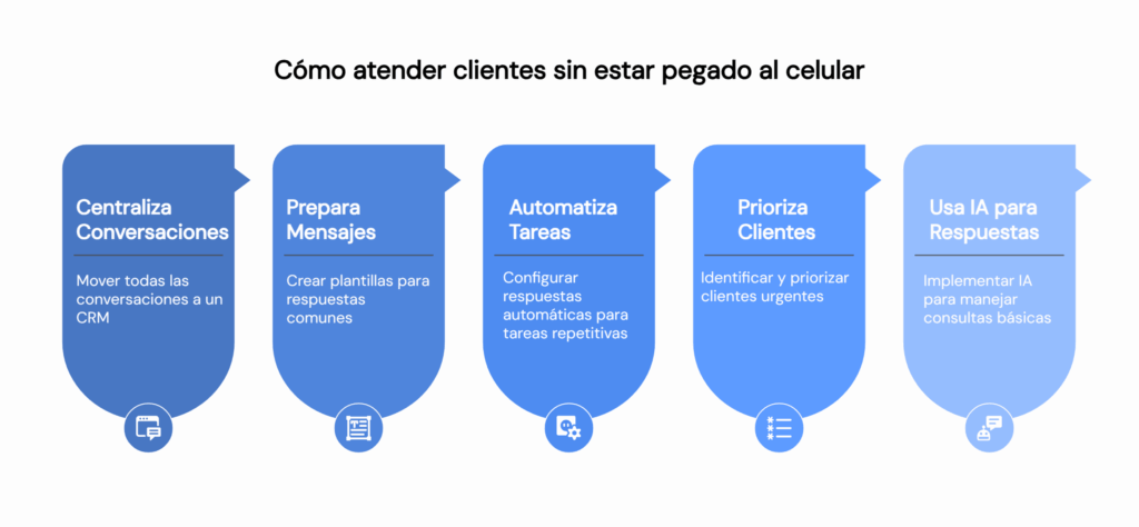 Para atender clientes sin depender del celular, tienes que convertir tus tareas repetitivas en procesos automáticos para reducir la cantidad de mensajes que respondes tú mismo. En la práctica, esto se logra dejando que la tecnología haga lo que te quita más tiempo: responder lo básico, organizar los chats y dar seguimiento automático.