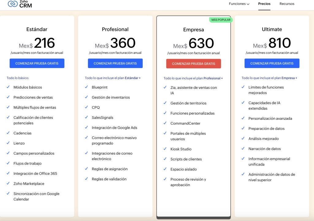 - Analiza precios y escalabilidad: revisa los precios del CRM y elige un uno con planes que se ajusten a tu negocio y que pueda crecer contigo a medida que aumentan tus necesidades.