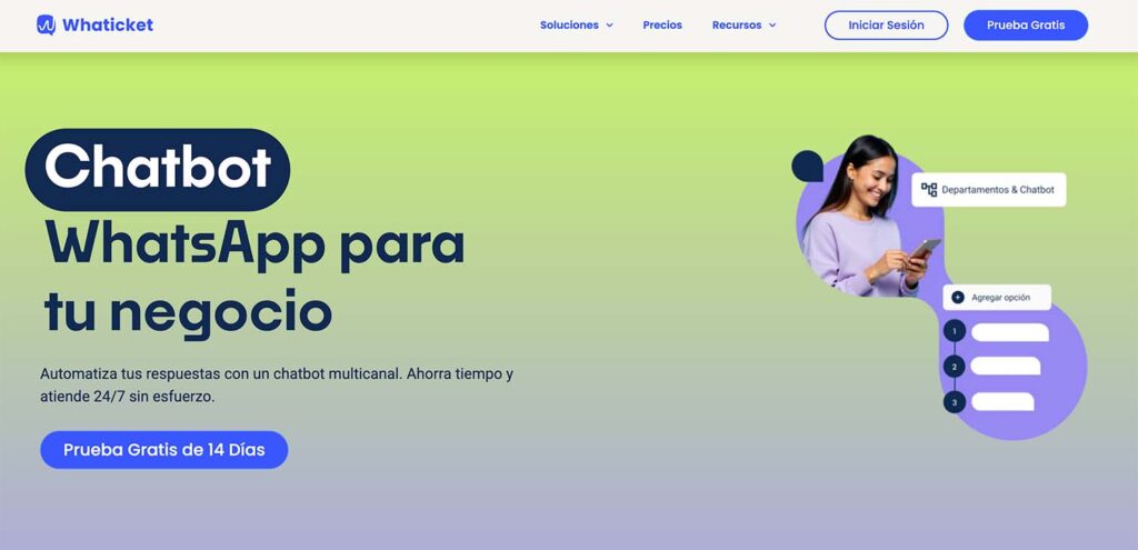 Whaticket es un chatbot con enfoque en negocios que centraliza mensajes de WhatsApp, Facebook e Instagram. Su IA facilita la gestión de consultas y asigna conversaciones a distintos agentes para no perder oportunidades de venta.