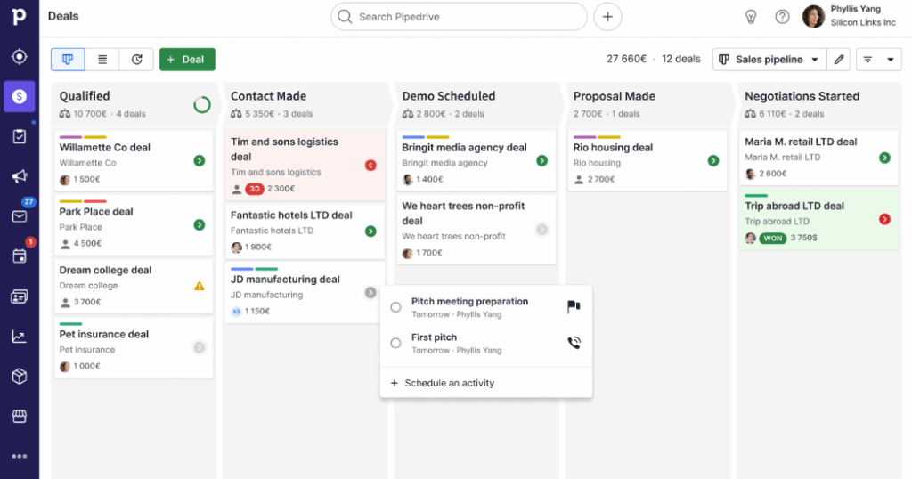 Pipedrive es especialmente útil para empresas que manejan múltiples oportunidades de venta y quieren optimizar cada etapa del embudo sin complicaciones técnicas. Su interfaz visual tipo “arrastrar y soltar” facilita la personalización del funnel y hacer un buen seguimiento de clientes.