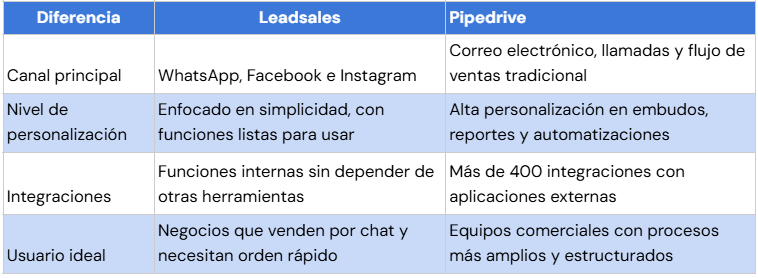La diferencia está en el enfoque. Leadsales está orientado a gestionar ventas desde mensajería y redes sociales, mientras que Pipedrive se adapta mejor a procesos comerciales basados en correos, llamadas y flujos de venta más tradicionales.