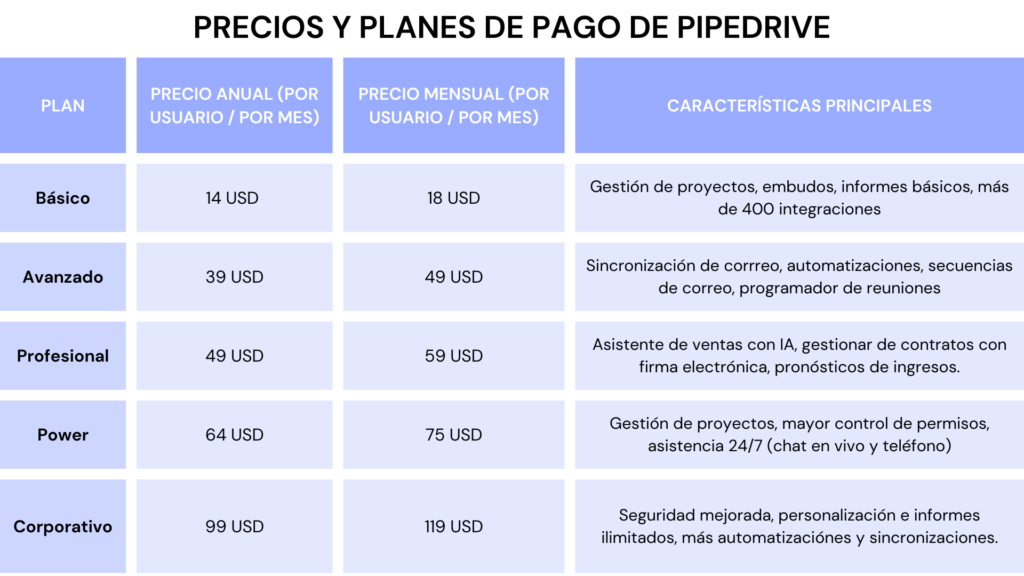 Pipedrive ofrece distintos planes según las necesidades de tu negocio. Aquí te comparto una comparación de cada uno de ellos: