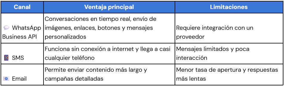 Cada canal de mensajería tiene sus ventajas, pero no todos funcionan igual. La mejor opción depende de lo que quieras lograr y del tipo de relación que tengas con tus clientes. Y si estás evaluando el WhatsApp Business API y su costo, vale la pena también comparar su valor frente a otros canales: