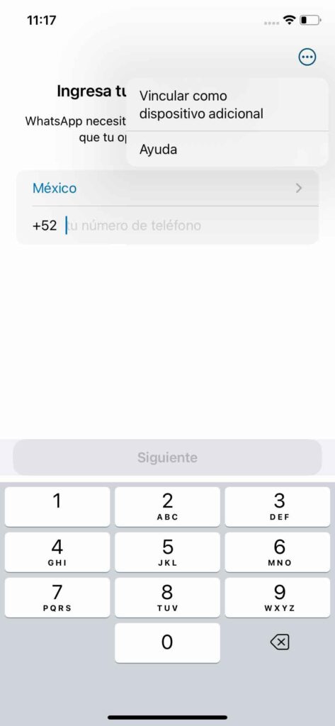 2. Toca los tres puntos que aparecen en la esquina superior derecha, y luego elige “Vincular como dispositivo adicional”. Verás un código QR que deberás escanear con tu teléfono principal.