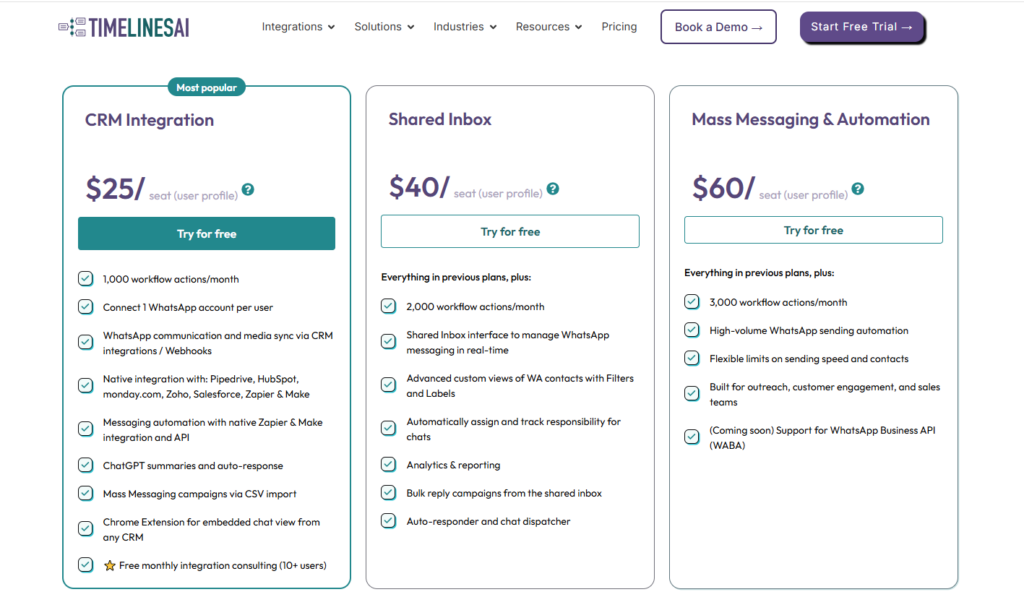 TimelinesAI is built for sales & support teams that use WhatsApp heavily and want to eliminate communication silos. It offers a unified inbox across multiple WhatsApp numbers, native integrations with HubSpot, Pipedrive, Zoho CRM, Salesforce, and monday.com, and workflow automations — all without needing the WhatsApp Business API.