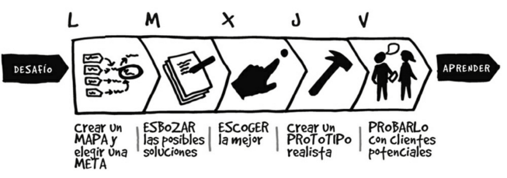 El enfoque de Design Sprint está basado en la creación de prototipos, el cuestionamiento interno del equipo y el testeo directo con el cliente.